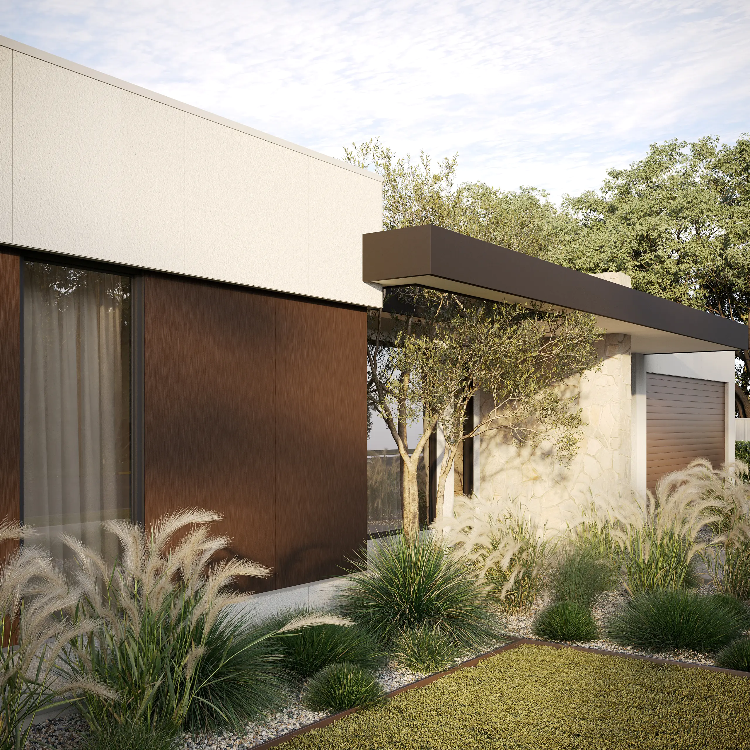 Adding a touch of grandeur, the cantilevered porch awning features a striking cutout that serves as a focal point at the entrance that can be enjoyed by the wider public. A sculptural like tree peeks through the opening, contributing to the overall cohesion of the architectural elements.